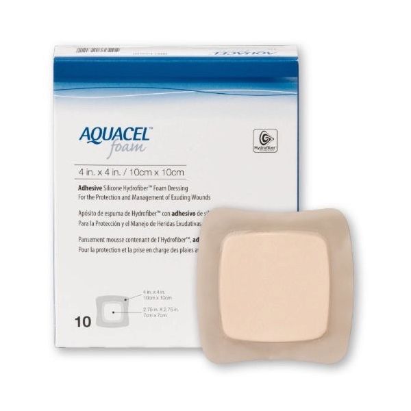 Aquacel Foam Adhesive dressings consist of a waterproof outer polyurathane film and a multilayer pad cosisting of a polyurathane foam which enhanced patient comfort and absorbs extra fluid, a hydofiber contact layer which gels on contact with exudate and provides a moist wound healing enviroment and a silicone adhesive border designed to adhere gently to the surrounding skin.