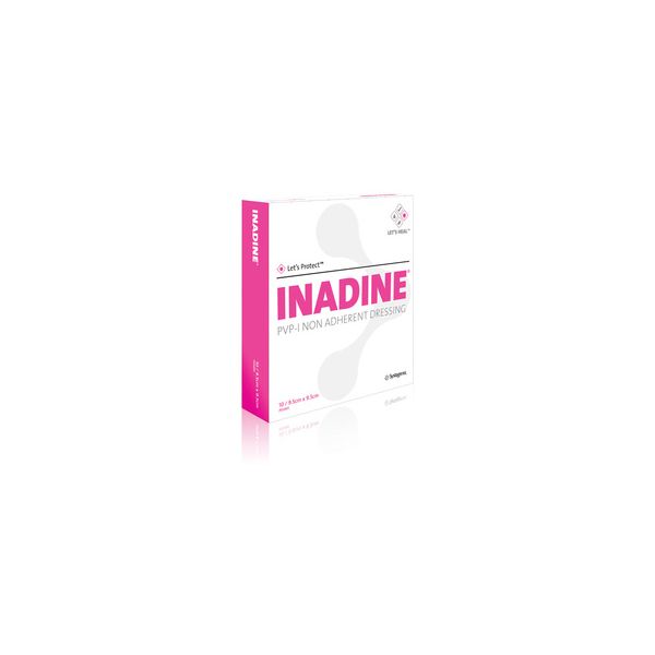 Inadine is a Non-adherent dressing, impregnated with a polyethylene glycol base containing 10% Povidone-Iodine. As iodine is released the dressing changes colour from orange to white provide a good indication of when to change the dressing.Suitable for the prevention and management of infection in ulcers, minor burns and minor skin injuries.