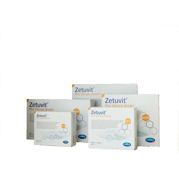 Zetuvit Plus Silicone Border Dressings 10cm x 10cm comprises of of a Superabsorbant fluid retaining layer together with a silicone wound contact layer and a water repellent outer layer. It has a transparent border that can be cut. The Superabsorbant layer can retain exudate even under compression dressings. The Silicone Wound contact layer makes dressing changes atraumatic.